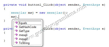 Aşağıda gözüktüğü gibi sınıfımızdan bir değişken oluşturduktan sonra istediğimiz metodu (mesaj1,mesaj2) çağırabiliriz.
