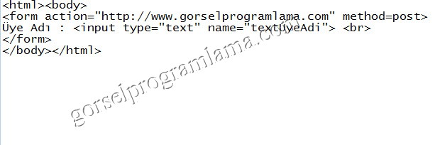 <html> <body> <form action="http://www.gorselprogramlama.com/" method=post> Üye Adı:<input type="text" name="textuyeadi"><br> </form> </body> </html>