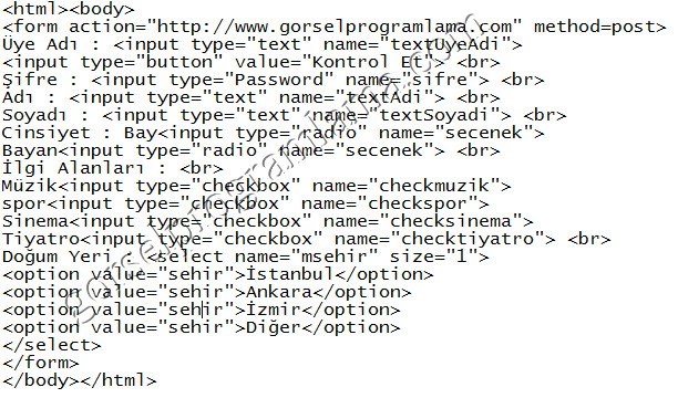 <html> <body> <form action="http://www.gorselprogramlama.com/" method=post> Üye Adı:<input type="text" name="textuyeadi"> <input type="button" value="Kontrol Et"><br> Şifre:<input type="password" name="sifre"><br> Adı:<input type="text" name="textadi"><br> Soyadı:<input type="text" name="textsoyadi"><br> Cinsiyet:Bay<input type="radio" name="secenek"> Bayan<input type="radio" name="secenek"><br> İlgi Alanlarınız:<br> Müzik<input type="checkbox" name="checkmuzik"> spor<input type="checkbox" name="checkspor"> Sinema<input type="checkbox" name="checksinema"> Tiyatro<input type="checkbox" name="checktiyatro"><br> Doğum Yeri:<select name="msehir" size="1"> <option value="sehir">İstanbul</option> <option value="sehir">Ankara</option> <option value="sehir">İzmir</option> <option value="sehir">Diğer</option></select> Mesaj:<br> <textarea name="mesaj" cols="40" rows="10"> </textarea><br><br> <input type="submit" value="Gönder"> <input type="reset" value="Temizle"> </form> </body> </html>