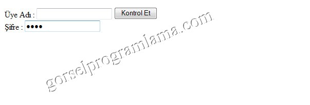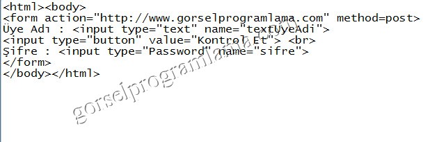 <html> <body> <form action="http://www.gorselprogramlama.com/" method=post> Üye Adı:<input type="text" name="textuyeadi"> <input type="button" value="Kontrol Et"> Şifre:<input type="password" name="sifre"> </form> </body> </html>