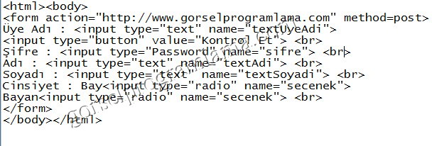 <html> <body> <form action="http://www.gorselprogramlama.com/" method=post> Üye Adı:<input type="text" name="textuyeadi"> <input type="button" value="Kontrol Et"><br> Şifre:<input type="password" name="sifre"><br> Adı:<input type="text" name="textadi"><br> Soyadı:<input type="text" name="textsoyadi"><br> Cinsiyet:Bay<input type="radio" name="secenek"> Bayan<input type="radio" name="secenek"><br> </form> </body> </html>