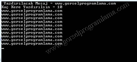 class Program static void Main(string[] args) string mesaj; int sayi; Console.Write(" Yazdırılacak Mesaj = "); mesaj = Console.ReadLine(); Console.Write("Kaç Kere Yazdırılsın = "); sayi = Convert.ToInt32(Console.ReadLine()); for (int i = 0; i < sayi; i++) Console.WriteLine(mesaj); Console.ReadLine();
