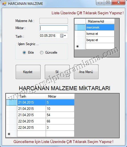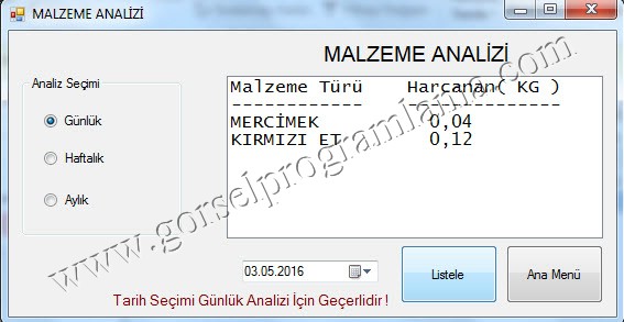 Günlük,Haftalık,Aylık harcanan malzeme analizi listesi