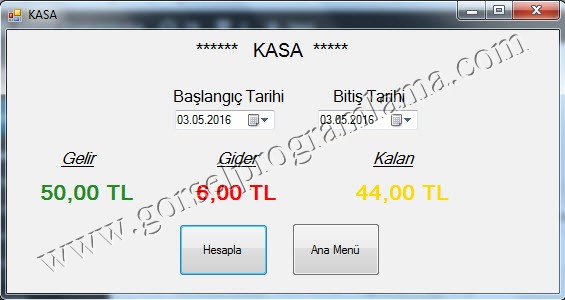 Kasa ile gelir , gider , kalan para miktarları listelenebilir. Ayrıca Tarih aralığı seçilebilir.