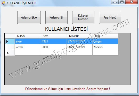 Kullanıcı işlemlerinde Kullanıcı ekleme , silme ve düzenleme işlemleri