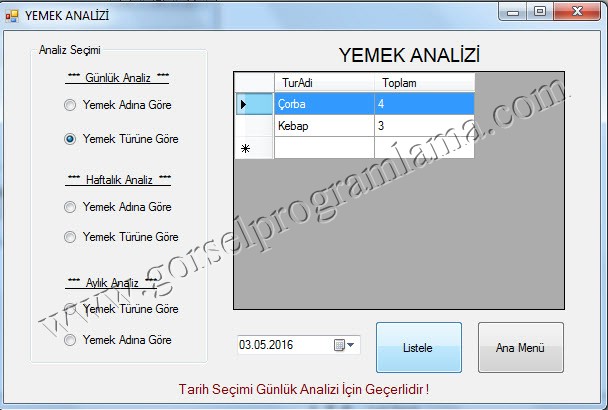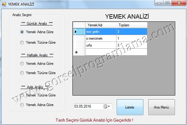 Yemek analizi bölümünde Yemek adına ve türüne göre günlük,haftalık,aylık analiz yapılıyor.