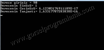 Console.WriteLine("Derecenin Tanjantı= {0}", Math.Tan((Math.PI * derece) / 180)); //  Daha fazla bilgi için : www.gorselprogramlama.com
