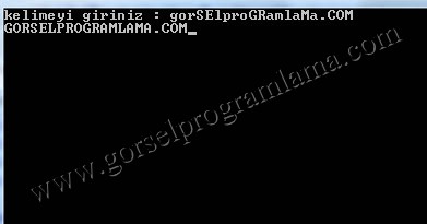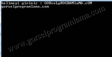 class Program { //Daha fazla bilgi için : www.gorselprogramlama.com static void Main(string[] args) { string kelime,buyukHarf; Console.Write("kelimeyi giriniz : "); kelime = Console.ReadLine(); buyukHarf = kelime.ToUpper(); Console.Write("{0}",buyukHarf); Console.ReadKey(); //Daha fazla bilgi için : www.gorselprogramlama.com } }