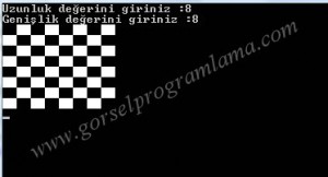 class Program { //Daha fazla bilgi için www.gorselprogramlama.com static void Main(string[] args) { Console.Write("Uzunluk değerini giriniz :"); int x = int.Parse(Console.ReadLine()); Console.Write("Genişlik değerini giriniz :"); int y = int.Parse(Console.ReadLine()); for (int i = 0; i < x; i++) { for (int j = 0; j < y; j++) { //Daha fazla bilgi için www.gorselprogramlama.com if ((i + j) % 2 == 0) { Console.BackgroundColor = ConsoleColor.Black; Console.Write(" "); } else { Console.BackgroundColor = ConsoleColor.White; Console.Write(" "); } } Console.WriteLine(); } Console.ReadKey(); } } //Daha fazla bilgi için www.gorselprogramlama.com