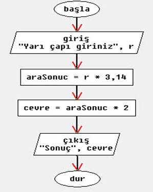 4- Yarıçapı klavyeden girilen dairenin çevresini hesaplayıp sonucu ekrana yazan programın akış diyagramını çiziniz. Çevre=2.pi.r Pi=3,14 r=yarıçap