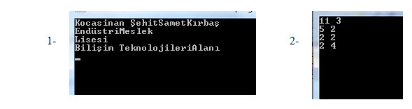 Console.Write(“Alan={0} Çevre={1}”,alan,cevre);