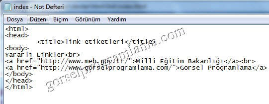 Örnek: Tıklandığında Milli eğitim bakanlığı ve görsel programlama sitesine giden html kodlarını yazalım.