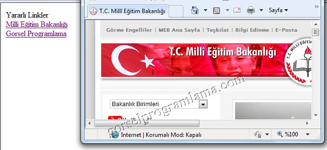 Örnek: Bir önceki örnekte Milli Eğitim bakanlığına giden linki ayrı pencereden açmak için gerekli kodları yazalım.