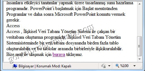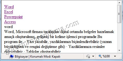 Daha sonra tıklandğı zaman gideceği yere (<a name=”word”></a>) kodlarını yazıyoruz.</a>’dan önce istenildiği kadar yazı yazılabilir.word yazısına tıklandığı zaman görüntü bu yazının başlangıcına gelecektir.