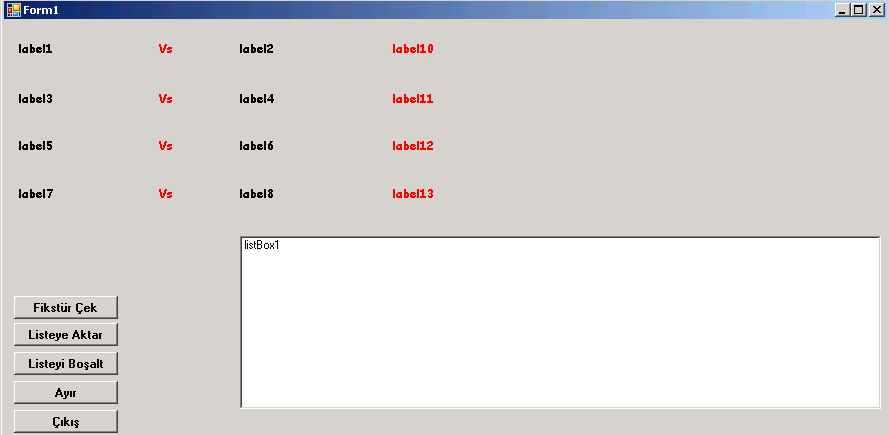 [code language=”CSharp”]Fikstür Çek butonu–>Bu butona bastığımız zaman ilk 8 label e takımları karşılaştırır. label10,label11,label12,label13 lere ise maçların hangi tarihte ve saat kacta yapılcağını yazar.