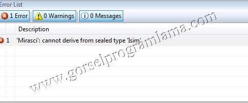 Programı çalıştırdığımızda aşağıdaki gibi kapalı tip uyarı mesajı ile karşılaşırız.Çünkü sealed ile sınıfın kalıtım vermesini engelledik.
