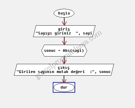 Klavyeden girilen sayının mutlak değerini alma Flowchart Klavyeden girilen sayının mutlak değerini alma Flowchart Abs fonksiyonu parametre (sayi) olarak girilen sayının mutlak değerini alarak sonuç değişkenine (sonuç) atar. flowprogramming Türkçe İNDİR