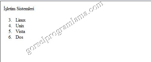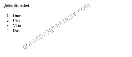 <ol> Etiketi : Sıralı listeleme işlemleri için kullanılır.type ile sıralı türünü belirtiyoruz.Üç seçenek vardır.Sayı ile : 1-2-3… , harf ile a-b-c…,roma rakamı ile i-ii-iii…Başlangıç herhangi bir şey belirtilmezse sayı için 1,harf için a,roma rakamı için i’dir.Eğer başlangıc değerini değiştirmek istyorsak start komutunu kullanmalıyız.Mesela 1 değil de 3’den başlamak için <ol type=”1″ start=”3″,a’dan değilde e’den başlamak istiyorsak <ol type=”1″ start=”5″> gibi kullanırız.Harf içinde alfabetik sıraya göre kaçıncı harften başlıyorsak onun sayısal yerini yazıyoruz.Roma rakamı içinde aynısı geçerli.listeleme etiketleri içerisindeki elamanları <li> etiketinden sonra yazıyoruz.Bu etiketi (/ işareti ile) kapatmamıza gerek yoktur.