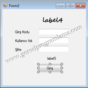 Giriş kodu,Kullanıcı Adı ve Şifre doğru ise Form1 açılacak değilse label5’te uyarı mesajı verecek (15 P)