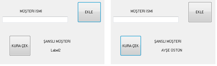 Yukarıdaki gibi bir program tasarlanacaktır. Soldaki gibi bir form tasarlanarak bir marketten alışveriş yapan müşterilerin ismi bir diziye girilecektir. İsim girme işlemi textboxa yapılacak ve ekle düğmesine tıklayınca isim diziye eklenecektir. Şanslı müşteriyi bulmak için KURA ÇEK düğmesi tıklanacak ve şanslı müşterinin ismi labelde görünecektir. Bu programı tasarlayınız.