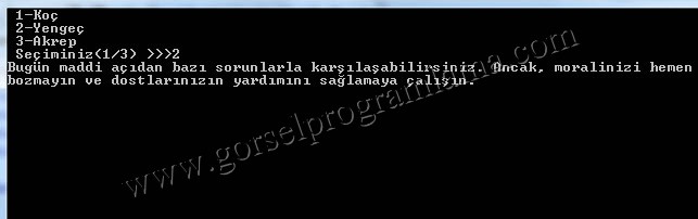 Console.Write(” 1-Koç \n 2-Yengeç\n 3-Akrep\n Seçiminiz(1/3) >>>”);
