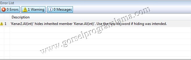 Çalıştırdığımızda aşağıdaki gibi uyarı mesajı alırız.Anlamı miras alınan sınıfta aynı isimde bir metot var diyor.İşte bu gibi durumlarda miras aldığımız sınıfata aynı isimden metot kullanmak istiyorsak virtual’ı kullanmalıyız.Aşağıdaki örnekte virtual’ı kullanarak hazırlayalım.Tabiki virtual’ı ekledikten sonra mirascı sınıfta metodu çağırmak için override’ı kullanacağız.