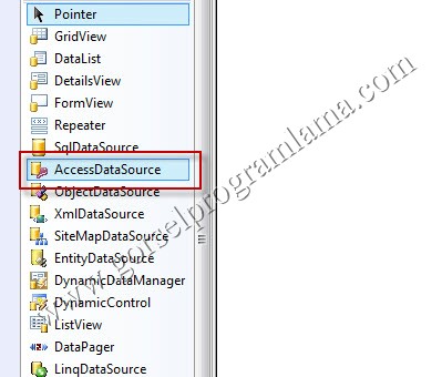 Microsoft access ‘ de oluşturmuş olduğunuz bir veri tabanını visual studioya kodsuz bir şekilde eklemek için öncelikle programımızın design bölümüne geçerek bir ” AccessDataSource ” eklemeliyiz.