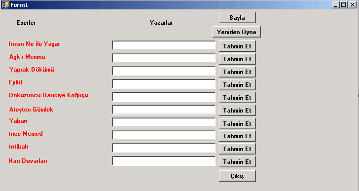 Örneğin :Textbox1 in içine Yazarın adını yazdık ve Yanındaki Tahmin Et butonuna tıkladığımız zaman eğer Textbox1 in içine doğru cevabı yazdıysak "Tebrikler Doğru Cevap" şeklinde bir mesaj veriyor ve Textbox1 in içi pasif oluyor.Eğer Textbox1 in içine yazdığımız cevap yanlış ise "Yanlış Cevap Verdiniz Lütfen Tekrar Deneyiniz" şeklinde mesaj vermektedir.